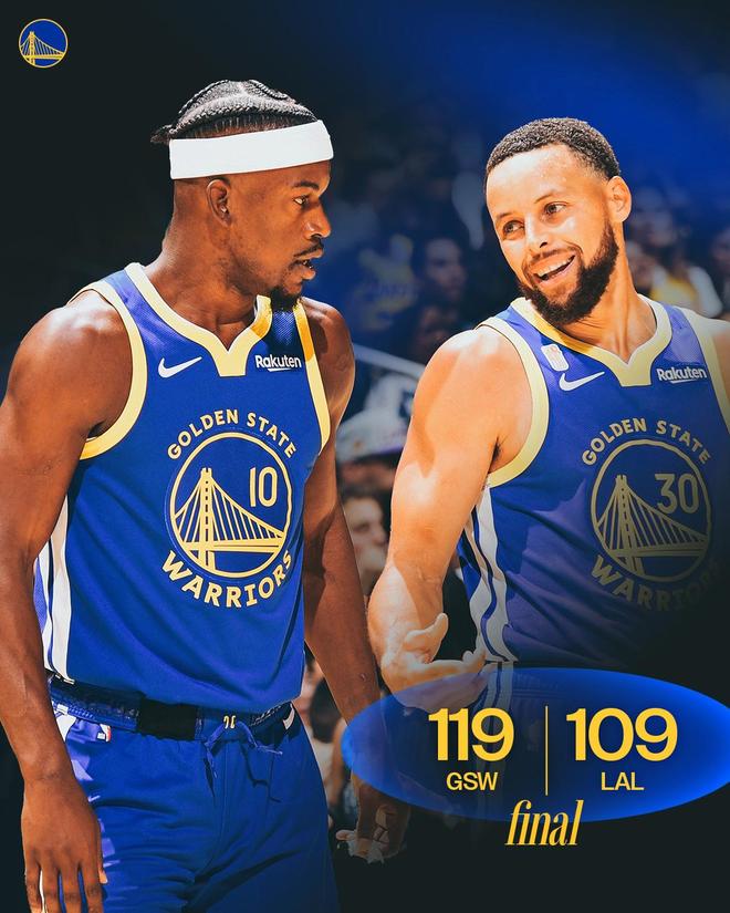格林命中空位远投,为勇士止血。里夫斯2罚1中,库里单打东契奇出手远投不进,文森特的三分球出手被库里封盖。巴特勒单打东契奇上篮得分,里夫斯2罚全中还以颜色。巴特勒罚进2球,里夫斯轰进续命远投予以回应。巴特勒助攻佩顿空切上篮得分,东契奇抛投打进还以颜色。巴特勒外线不中,库明加抢下前场篮板,库里轰进超远三分球,勇士领先10分得以锁定大局。里夫斯上篮得分,库里2罚全中,雷迪克请求暂停。东契奇高难度远投不进,比赛时间走完。最终,勇士以119比109力克湖人,取得赛季开门红。